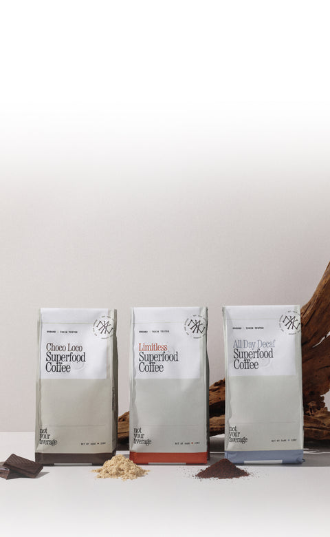 Toxin-tested organic arabica coffee from Peru + Raw Cacao + L-Theanine + Maca Root + Lucuma